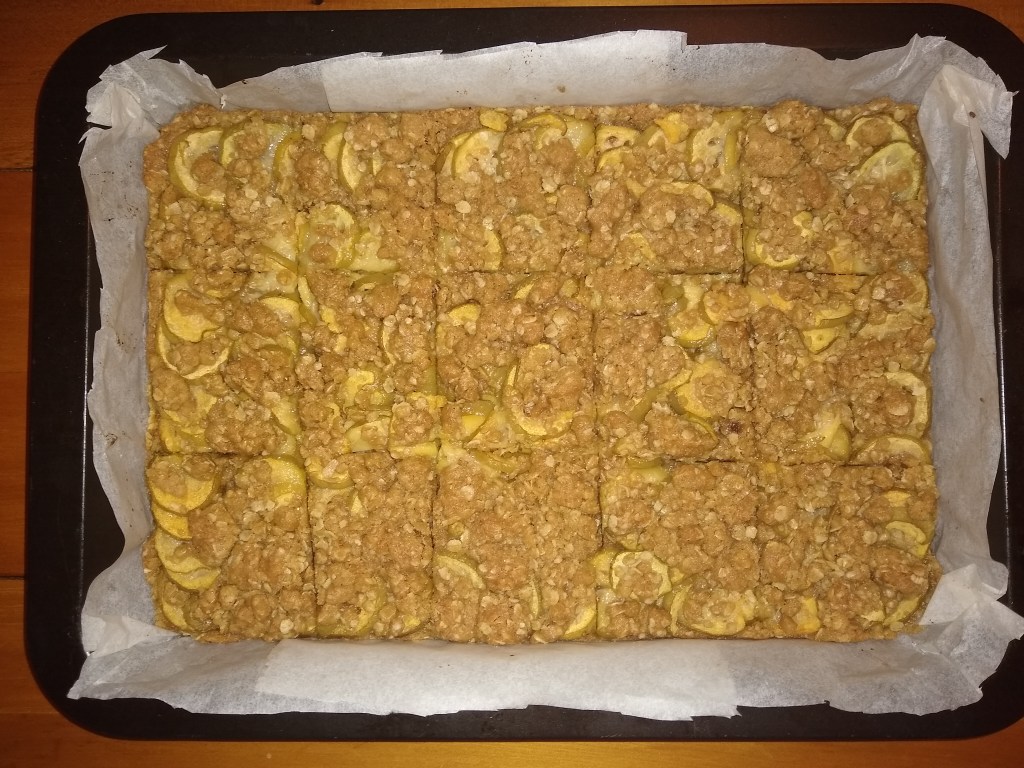 Feijoas: We washed the feijoas. Miss 5 cut the flower ends off with a butter knife (for safety) and we put them through the food processor to slice them. We then arranged the slices across the top of the base. Once covered with feijoas, we crumbled the last 1/3 of base mix over the top.